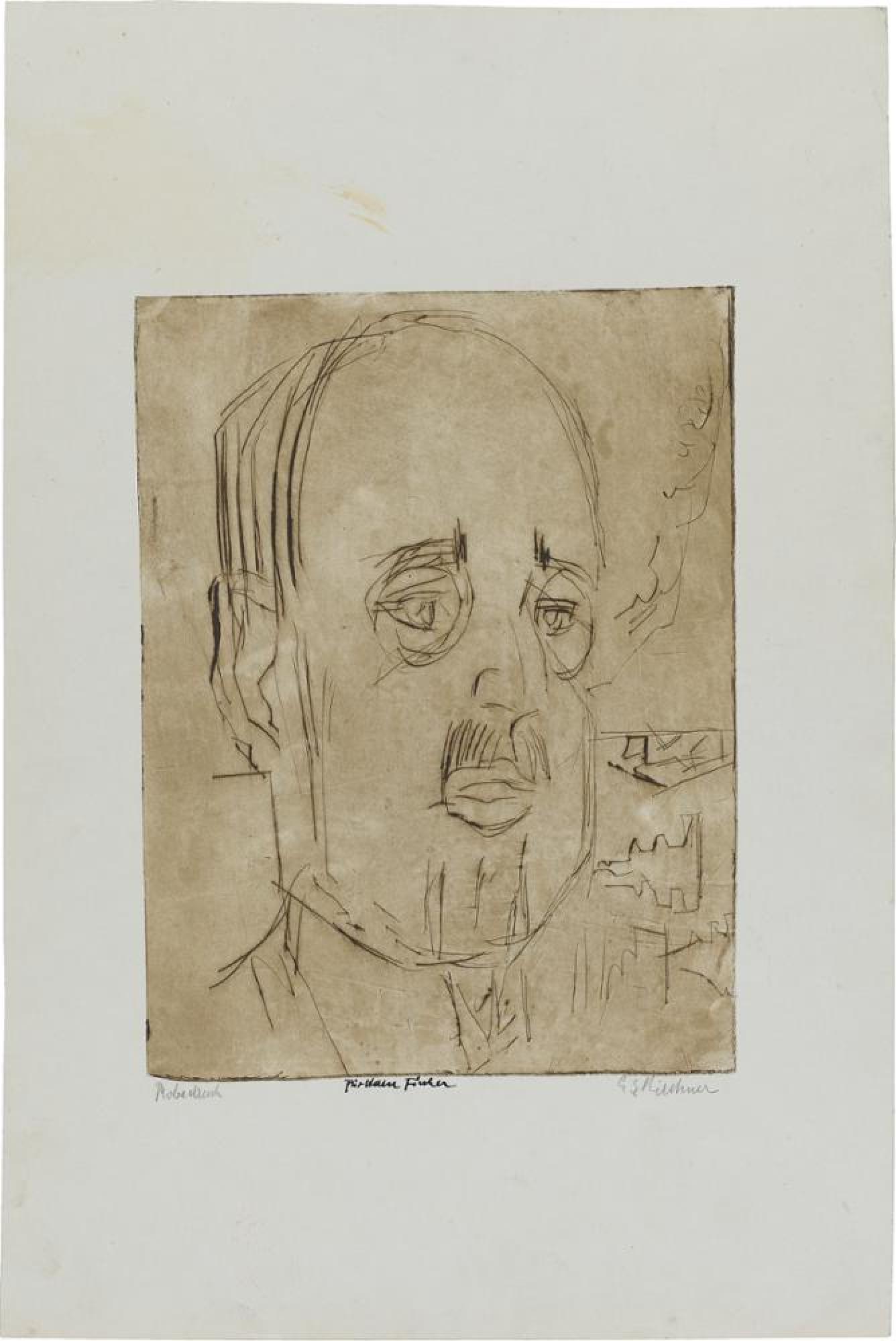 Im März 1924 besuchte der damalige Direktor der Staatsgalerie Stuttgart, Otto Fischer (1886-1948), Ernst Ludwig Kirchner in seinem Domizil in Frauenkirch bei Davos und musste feststellen: »Er [Kirchner] ist etwas schwellenhaft und in vorgefasste Ideen und Entschlüsse hartnäckig verbohrt.« Anlässlich des Besuches porträtierte ihn der Künstler. Fischer war ab 1927 Direktor des Kunstmuseums Basel und stand auch weiterhin mit Kirchner in Kontakt. 1935 schickte der Künstler Fischer diesen Probedruck der Radierung: »Ich suchte, was ich Ihnen als kleine Aufmerksamkeit senden könnte, und fand die Radierung Ihres Kopfes, die ich vor Jahren einmal machte und von der ich nicht weiß, ob Sie sie haben. Ich sende sie Ihnen hier mit, haben Sie sie, so könnten Sie sie ja der Sammlung stiften.« Das Blatt trägt die handschriftliche Widmung »Für Herrn Fischer«.