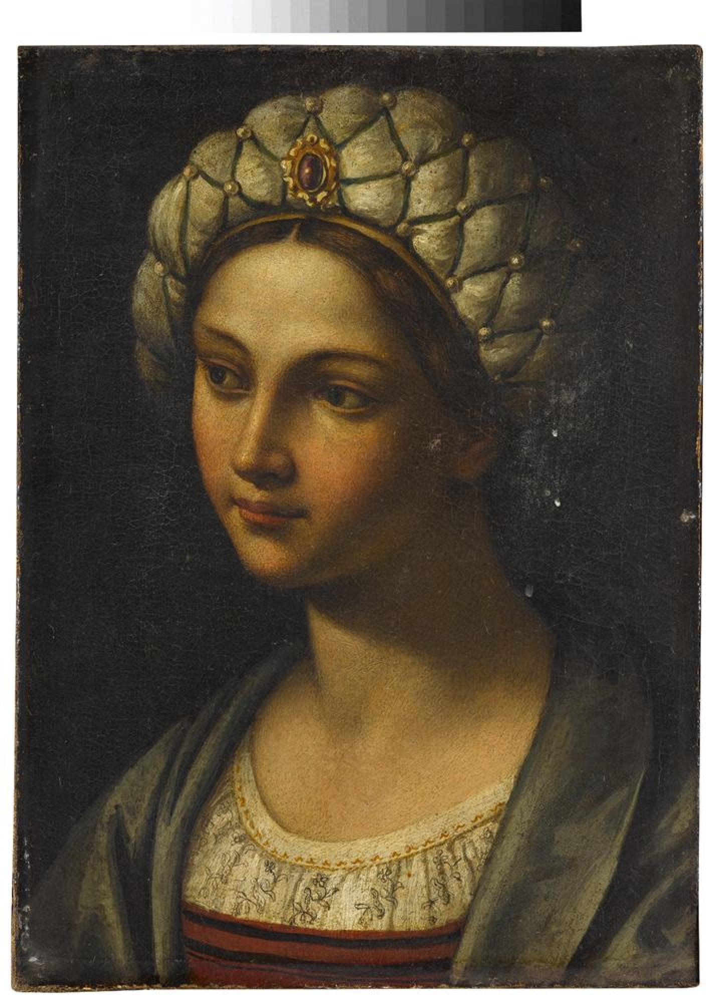 Die porträtähnliche Wiedergabe einer jungen Frau mit elegantem, turbanähnlichem Kopfputz wurde 1852 mit der Sammlung Barbini-Breganze erworben. Die junge Frau, die scheinbar auf etwas reagierend aus dem Bild blickt und mit ihrer Kopfbedeckung eher wie eine antike Prophetin, eine sogenannte Sibylle, oder eine alttestamentliche Heldin wirkt, wurde im 19. Jh. als Porträt beschrieben und dem Barockmaler Ludovico Carracci (vor 1555-1619), der wie seine Vettern Agostino (1557-1602) und Annibale (vor 1560-1609) zu den wichtigsten Vertretern der Bologneser Malerei des 17. Jh. Gehört, zugeschrieben. Das auf dunklem Grund modellierte kontrastreich verschattete Gesicht erinnert motivisch an die Porträts der Carracci. Die Kleidung und der abgewandte Blick hingegen lassen vermuten, dass die Figur als Büste aus einem größeren Zusammenhang gelöst wurde. Es könnte sich demnach um ein überarbeitetes Fragment oder eine spätere Wiederholung handeln - derartige Köpfe waren in Porträtgalerien des 19. Jh. durchaus beliebt und auch in der Slg. Barbini-Breganze vertreten (vgl. Inv. Nr. 318).