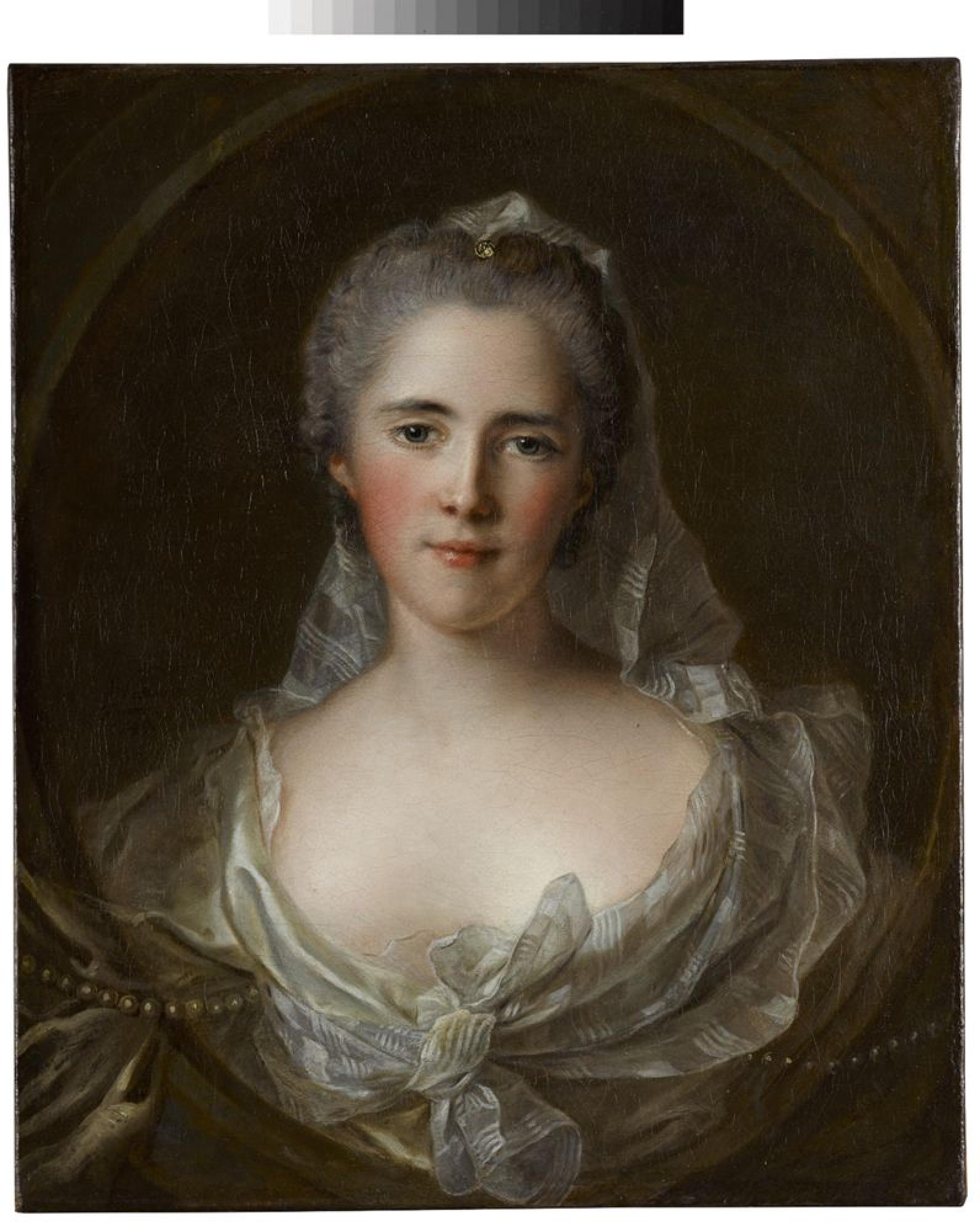 Es ist nicht bekannt, welche junge Frau sich in diesem Bildnis darstellen ließ. Der Maler dagegen, Jean-Marc Nattier, der auf Porträts der französischen Hofgesellschaft spezialisiert war, hat sein Werk signiert und auf das Jahr 1749 datiert. Mehrere Details demonstrieren Nattiers Gewandtheit auf dem Gebiet der Bildnismalerei: Ein warmes Licht umfängt die Dargestellte und lässt die Gestalt plastisch gegenüber dem dunklen Hintergrund hervortreten. Ihre glatte, schimmernde Haut steht in einem deutlichen Kontrast zu ihrem feinen gepuderten Haar und dem steifen Stoff des Schleiers. Mit dieser Betonung der Texturen, die durch pastose Farbakzente unterstützt wird, ahmt Nattiers Ölgemälde eine andere Technik, die im Rokoko so beliebte Pastellmalerei, nach. Ein ungewöhnlicher Effekt ist der gemalte ovale Rahmen, der eine Maueröffnung (»Okulus«) suggeriert. Das Spiel mit Bild und Realität wird durch die Perlenschnüre und Draperien verstärkt, die auf den ersten Blick als Rahmendekor erscheinen, aber zugleich als Schmuck der porträtierten Dame interpretiert werden können.