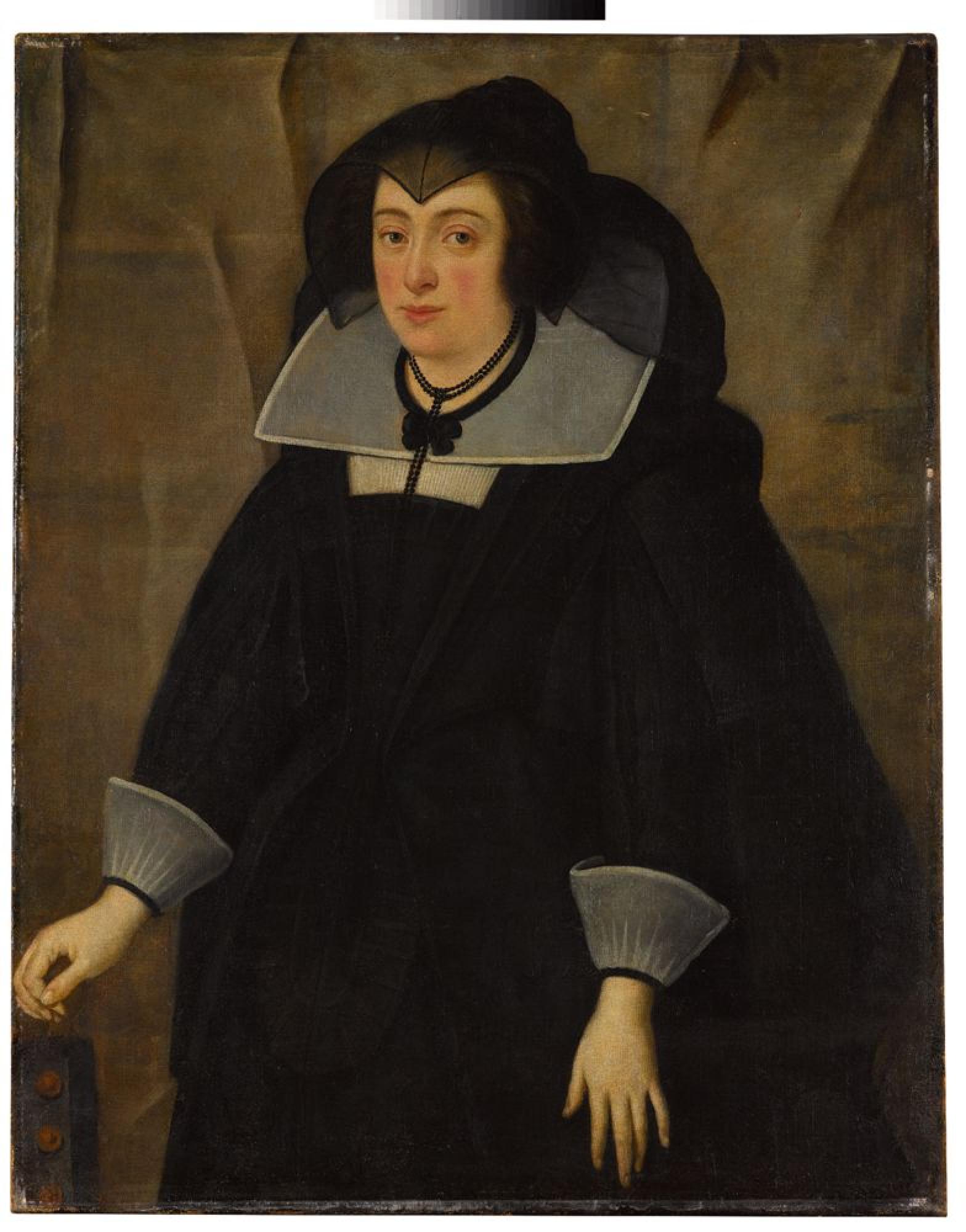 Ganz in Schwarz gehüllt erscheint die junge Frau im Gewand einer Witwe. Als solche ist sie an der schwarzen Kappe zu erkennen. Ihr breiter weißer Kragen ist mit einer schwarzen Schleife vor dem Hals gebunden, eine weite schwarze Haube, die sie vom Kopf gestreift hat, hängt über den Schultern. Das Bildnis der jungen Frau wurde seit seiner Erwerbung aus der Sammlung Barbini-Breganze mit oberitalienischer Porträtmalerei verbunden; das Gewand und der Typus hingegen erinnern an Florentiner Witwenkleidung des 17. Jh.: Maria Magdalena von Österreich (1589-1631), Großherzogin der Toskana, ließ sich nach dem Tod ihres Ehemannes Cosimo II. de‘ Medici (1590-1621) in solcher Tracht darstellen, ebenso Maria de‘ Medici (1575-1642), Regentin von Frankreich nach dem Tod von Heinrich IV. (1572-1610). Ihr Porträt in Madrid (Museo Nacional del Prado), das um 1622 unvollendet blieb, zeigt die Witwe vor einem nur in Untermalung vorbereiteten Vorhang - ein würdevolles Motiv in repräsentativen Bildnissen, das den Rang der Dargestellten unterstreichen soll und in der Regel royale Farben zeigt. Mit dem graubräunlichen Grund scheint das Stuttgarter Gemälde im späten 17. oder 18. Jh. den unvollendeten Anschein der Untermalung auf eigentümliche Weise zu wiederholen.