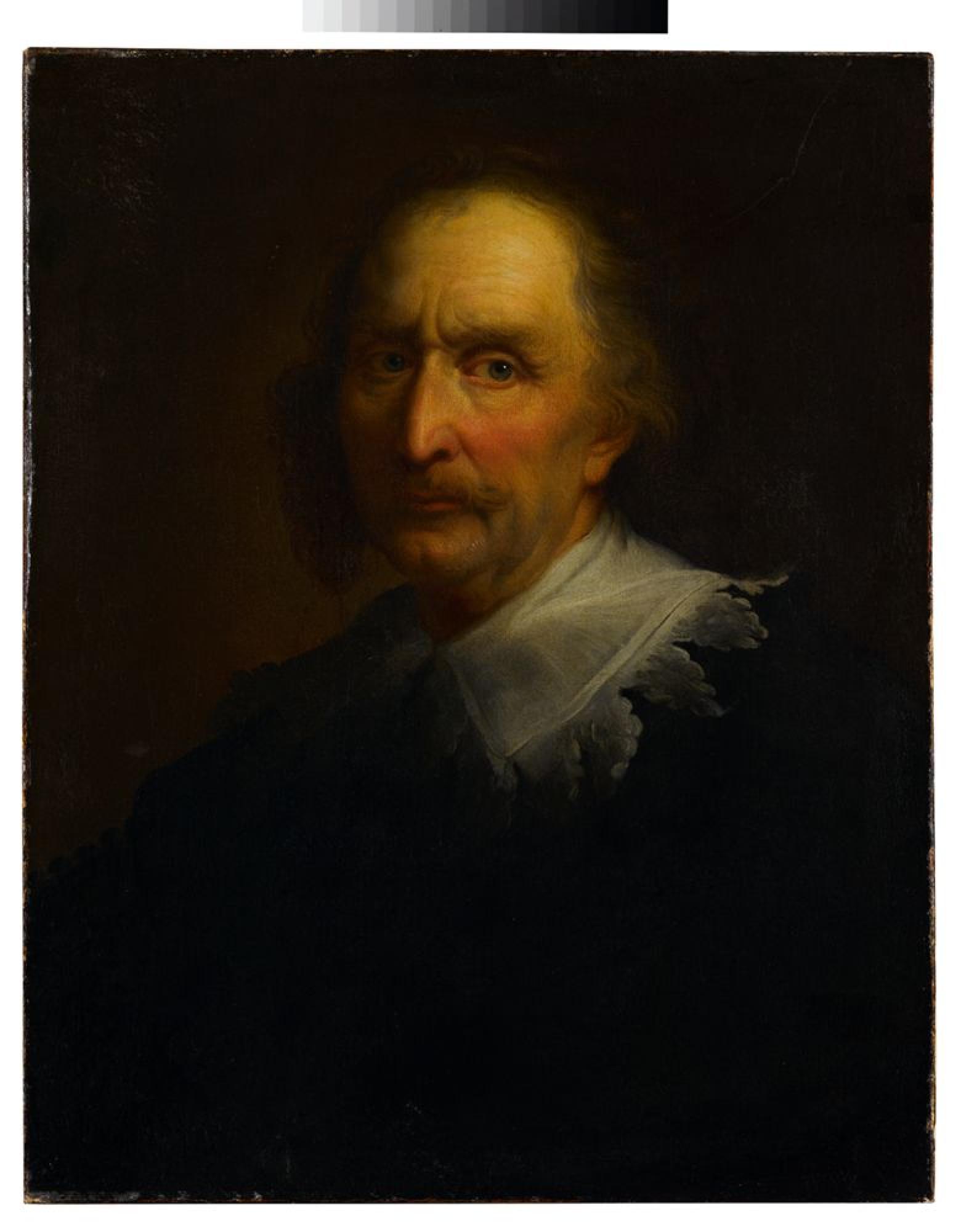 In weiches Licht getaucht blickt der ältere Mann aus dem Bild. Er trägt ein schwarzes Gewand, dass sich kaum vom dunklen Hintergrund absetzt, nur ein feiner weicher Spitzenkragen rahmt das Gesicht. Seine Stirn wird sanft von einem gelblichen Licht erhellt, das schüttere Haupthaar und die feinen Barthaare sind mit lebendigem Pinselstrich charakterisiert, die Wangen rosig frisch. In den älteren Katalogen wird das Bild als Werk von Jan Lievens geführt (1607-1674), einem Zeitgenossen Rembrandts, der mit diesem gemeinsam in Leiden lernte. Anders als die freiere und malerisch wildere Manier Rembrandts hatte Lievens schnell einen eleganten und beruhigteren Stil entwickelt, der bei seinen Auftraggebern besonders gefragt war. Das Stuttgarter Bild steigert die warme Farbe des Inkarnats und die weich verriebenen Konturen in ein gelblich schimmerndes Kolorit, eine Tendenz, die sich u.a. bei deutschen Nachahmern der niederländischen Porträtisten wiederfindet. Heute gilt es als anonymes Werk, das womöglich um 1700 in Deutschland entstanden ist.