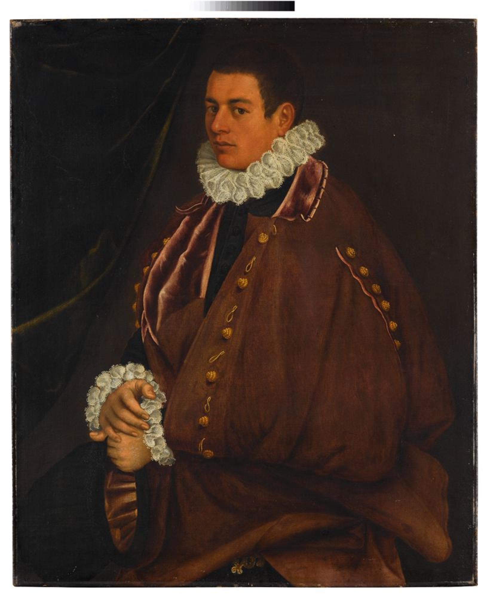 In einen weiten Mantel gehüllt blickt der junge bartlose Mann mit kurzem Haarschnitt aus dem Bild. Ärmel und Halskrause sind gesteift und dicht gerollt, und erinnern damit an eine internationale Mode unter den Adeligen Europas, die bis ins frühe 17. Jh. andauerte. Die Knopfleiste über den Schultern erlaubte es seinem Träger, den Armen bei Bedarf mehr Bewegungsfreiraum zu geben. Das in scharfer Farbtrennung von Dunkelrot zu Weiß gemalte Samtfutter des Kragens verleiht dem dunklen Stoff Lebendigkeit und erinnert entfernt an die in Bergamo im 16. Jh. entwickelte Porträtmalerei, als deren wichtigster Vertreter Giovanni Battista Moroni (1520/24-1579) gelten darf. Wegen dieser Nähe hat Wilhelm Suida das Gemälde versuchsweise dem oberitalienischen Porträtisten Giovanni Paolo Cavagna (1550-1627) zugeschrieben. Als Teil der Sammlung Barbrini-Breganze gehört es zu einer kleinen Reihe von Bildnissen, die heute durchweg später datiert werden als die ursprünglich vermutete Entstehung im 16. Jh. (vgl. Inv. Nr. 287, 300).