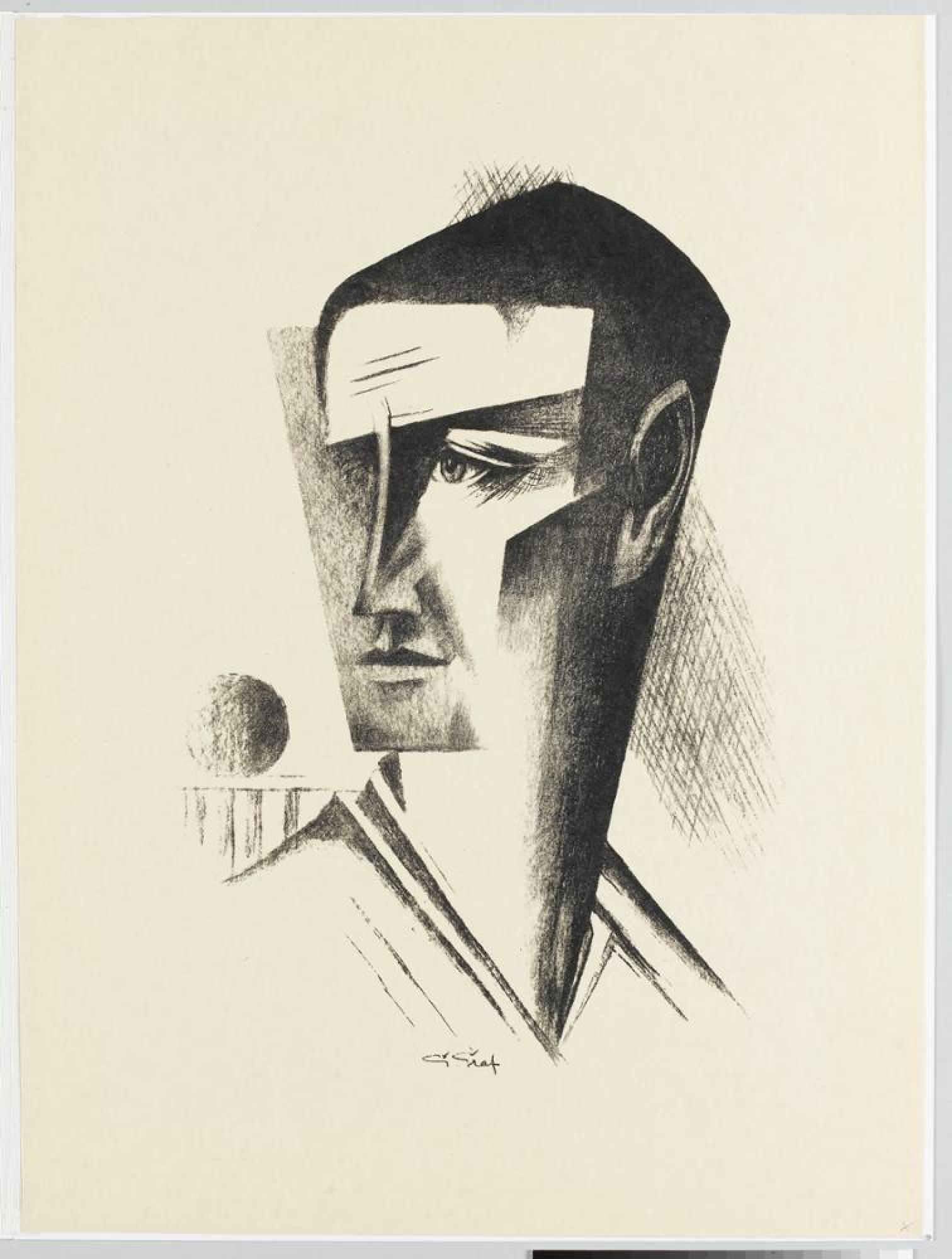 Die in der Mitte unten im Stein signierte Lithographie mit dem »Porträt eines Mannes« zeigt Verwandtschaft zu den beiden Selbstbildnissen von Oskar Schlemmer in der Staatsgalerie (»Männlicher Kopf I«, 1912, Inv.Nr. 2812; »Männlicher Kopf II«, 1913, Inv.Nr. 2604). Die blockhaften geometrischen Formen verweisen bei Schlemmer wie auch bei Graf deutlich auf Einflüsse des Kubismus. Gottfried Graf, seit 1909 an der Stuttgarter Akademie Schüler von Adolf Hölzel, reiste 1913 nach Südfrankreich, wo er den Vertretern des französischen Kubismus, Jacques Villon und Albert Gleizes, begegnete. Nach der Rückkehr nach Stuttgart setzte er sein Studium an der Akademie fort und freundete sich mit Oskar Schlemmer, Johannes Itten und Hermann Stenner an. 1937 wurden viele seiner Werke als »entartet« beschlagnahmt und zerstört; nach der Entlassung aus dem Lehramt 1938 starb Graf wenig später.