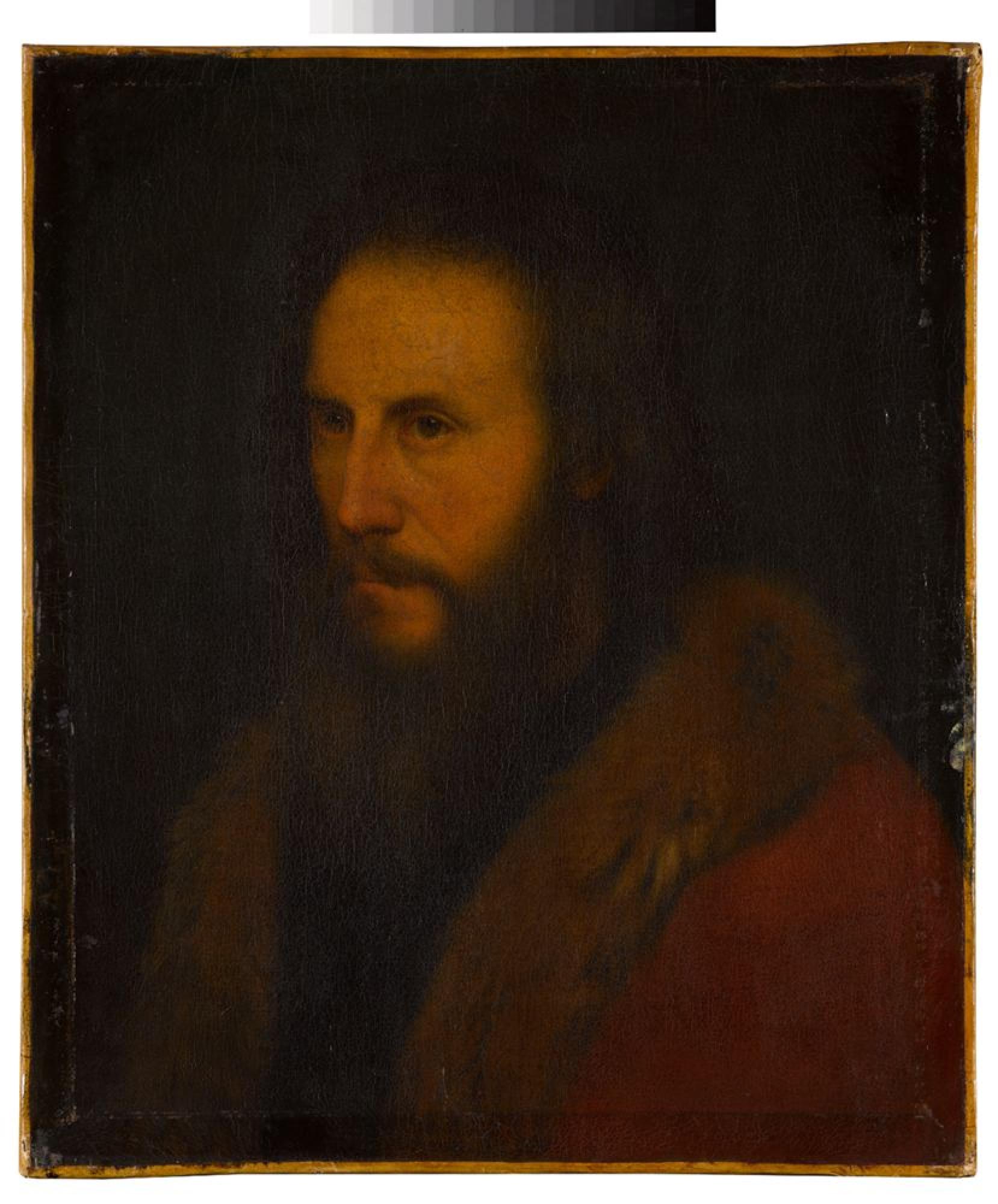 dunklem Grund wendet sich der bärtige Dargestellte ins Dreiviertelprofil. Gekleidet ist er in einen weiten roten Mantel mit Pelzkragenbesatz. Seine Ausrichtung nach links ist ungewöhnlich und lässt vermuten, dass das Gemälde entweder ein Pendant besessen hat oder auf eine druckgraphische Vorlage zurückgeht, die ihrerseits ein Porträt seitenverkehrt wiederholt. Im 19. Jh. wurde das Bild aus der Sammlung von König Karl I. von Württemberg (1823-1891) dem venezianischen Renaissancemaler Giorgione (1577/78-1510) zugeschrieben, Bernhard Berenson hielt es für ein Werk des Veroneser Malers und Kupferstechers Paolo Farinati (1524-1606), wohl wegen einer gewissen Nähe des bärtigen Profils zu Porträts, die man für Werke Farinatis hält (z.B. Gent). Die italienische Herkunft des Porträts ist hingegen mit Blick auf die Mode fraglich. Denkbar ist, dass es sich um eine historisierende Interpretation eines niederländischen oder flämischen Vorbildes aus dem 17. Jh. handelt.