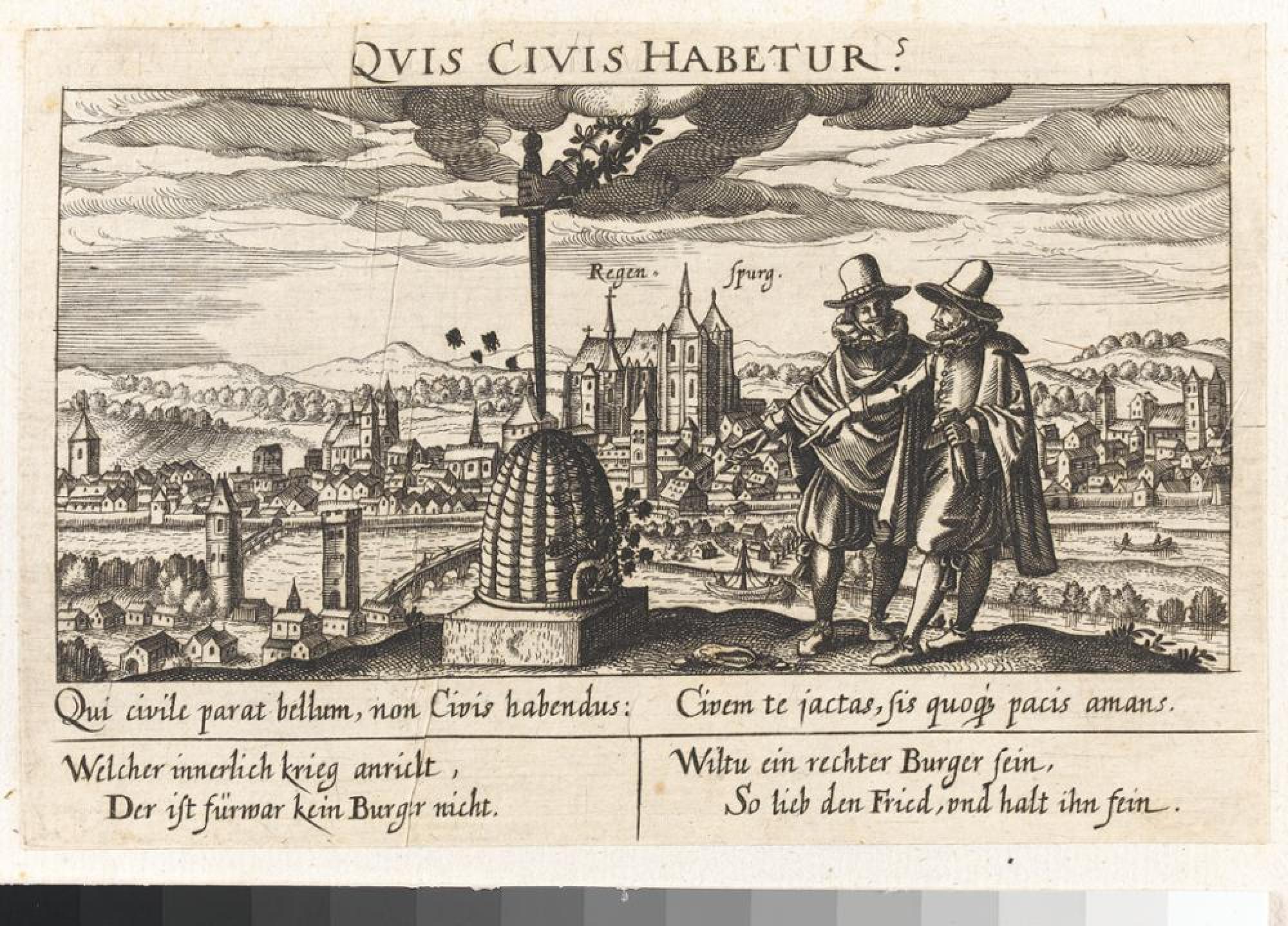 Zwei Bürger diskutieren über einen Bienenkorb, das Emblem wahre und beständige Einigkeit, die den süßen Honig hervorbringt. Der (in diesem Exemplar nicht erhaltene) Kommentar erläutert das mit Efeu umwundene Schwert, dessen Spitze nach unten zeigt, als Zeichen des Friedens und der Ruhe innerhalb der Bürgerschaft. [HMK] Friedensbilder in Europa. Verbundprojekt: »Übersetzungsleistungen von Diplomatie und Medien im vormodernen Friedensprozess. Europa 1450-1789.« Gefördert vom Bundesministerium für Bildung und Forschung, 2009-2012.