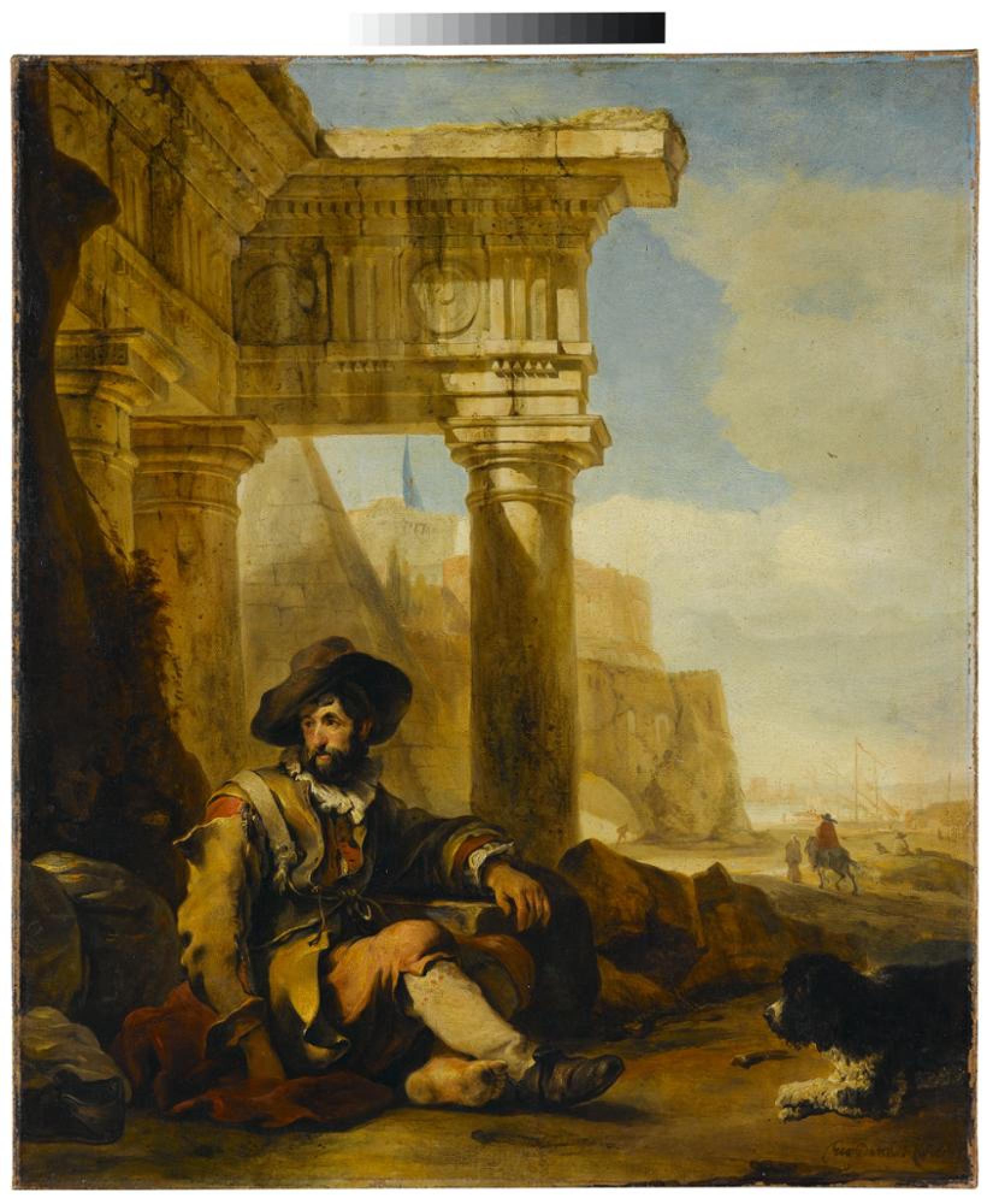 Weenix gehört zu den "Italianisanten", jenen Malern, die während und nach ihrer Italienreise die Erfahrung der südlichen Landschaft in ihre Kompositionen aufnahmen. Mit seinem italianisierten Namen "Gio. Batta Weenix" signiert, zeigt der Maler in diesem Bild einen Bettler, dessen Kleidung auf frühere, bessere Verhältnisse verweist. Vor phantasievoll zusammengestellten Ruinen hat er sich mit seinem Hund am Ufer eines schiffbaren Gewässers niedergelassen. Die Darstellung kann als Hinweis auf die gefahrvolle Lebensreise des Menschen verstanden werden, dessen Glück und Wohlstand so vergänglich sind wie die steinernen Zeugnisse einstiger Größe.