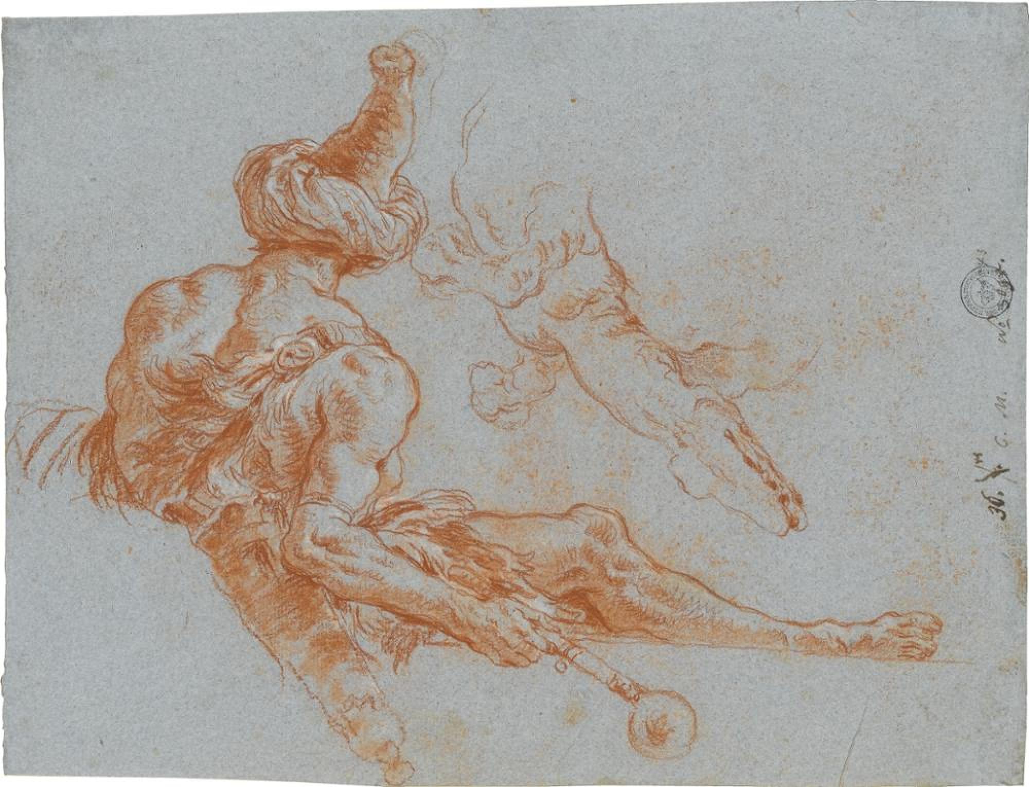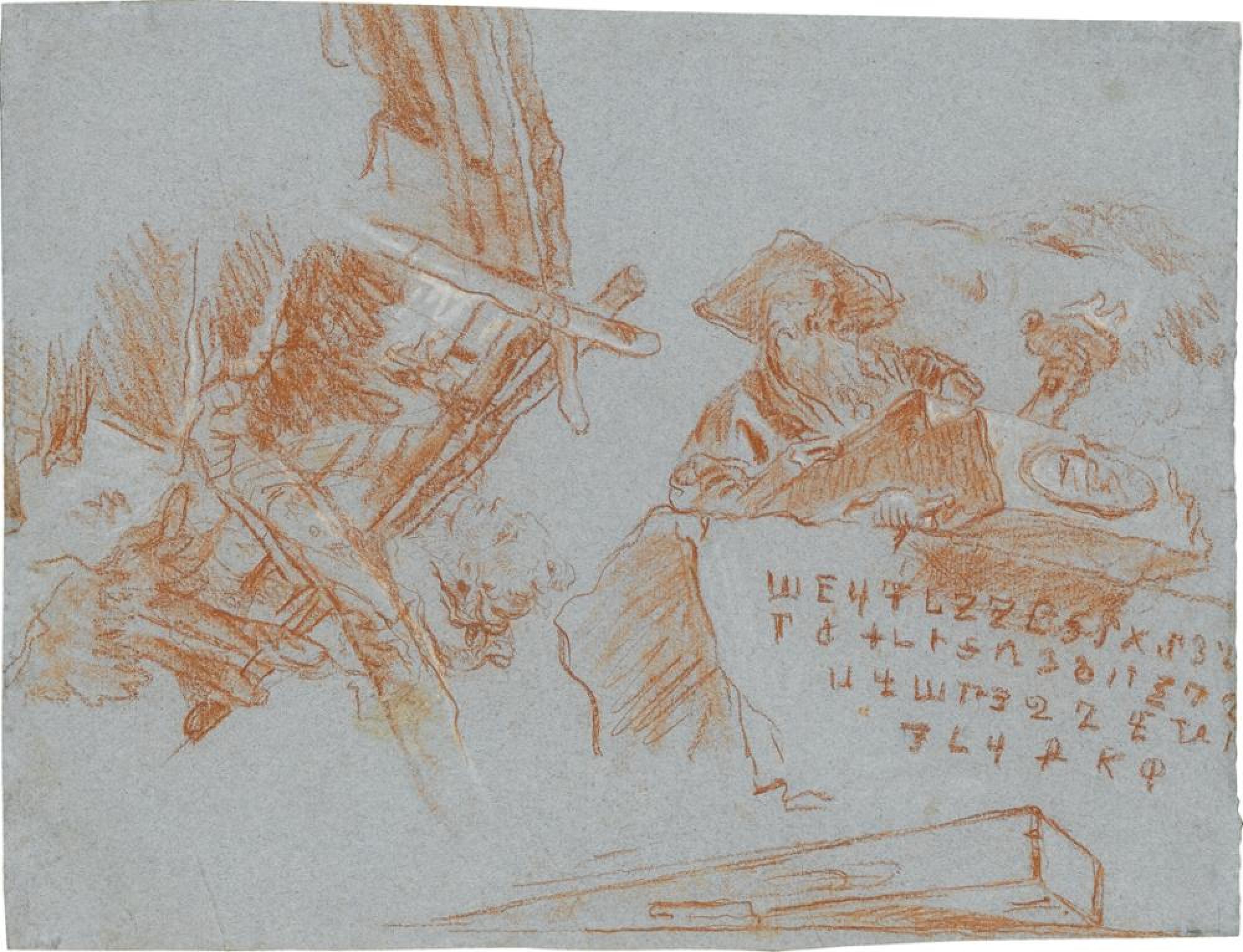 Der Ricordo (Nachzeichnung zur Erinnerung) Giovanni Domenico Tiepolos zeigt auf der Vorderseite zwei Figuren aus der »Amerika« der Würzburger Treppenhausdecke, den links unterhalb der Personifikation des Erdteils neben der Stuckfigur Sitzenden mit Turban sowie das Krokodil, das der Mann rechts im Fresko über der Schulter trägt (Massimo Gemin und Filippo Pedrocco: Giambattista Tiepolo. I dipinti. Opera completa, Venedig 1993, Nr. 415; Der Himmel auf Erden. Tiepolo in Würzburg, hg. von Peter O. Krückmann, Ausst.-Kat. Würzburg, Residenz [15.2.-19.5.1996], München und New York 1996, Bd. 1, Abb. S. 104). Letzterer findet sich mit dem Krokodil ebenso auf der Rückseite einer weiteren Stuttgarter Zeichnung (Inv. Nr. C 1484). Auf der Rückseite unseres Blattes sind verschiedene Ricordi nach Szenen aus dem »Asia«-Bild vereint (Würzburg 1996, Bd. 1, Abb. S. 112-113): Rechts der bärtige Mann mit breitem Hut und einer Fackel in der Hand, der vielleicht auf seinem Zeichenblock die gesamte Szene dokumentiert und hinter dem Steinblock mit den Schriftzeichen steht, der Asien als Geburtsland der Schrift und Wissenschaft symbolisiert. Auch die Schildkröte, die mit ihrem Kopf über dem Stein hervorlugt, ist angedeutet. Dreht man das Blatt, so erscheint die 1752 gemalte Gebäudekonstruktion vom äußersten linken Ende des Freskos. Noch unter ihr liegt eine Nachzeichnung nach Giovanni Battista Tiepolos (1696-1770) Armida aus dem Gemälde »Rinaldo verlässt Armida«, das wohl im Winter 1752/53 entstanden ist (Gemin/Pedrocco 1993, Nr. 420). Der Balken, der unten in die Darstellung hineinragt, gibt das entsprechende Detail unter den Handels- und Kaufleuten im »Afrika«-Fresko wieder (Würzburg 1996, Bd. 1, Abb. S. 108; vgl. Inv. Nr. C 1479, C 1473).