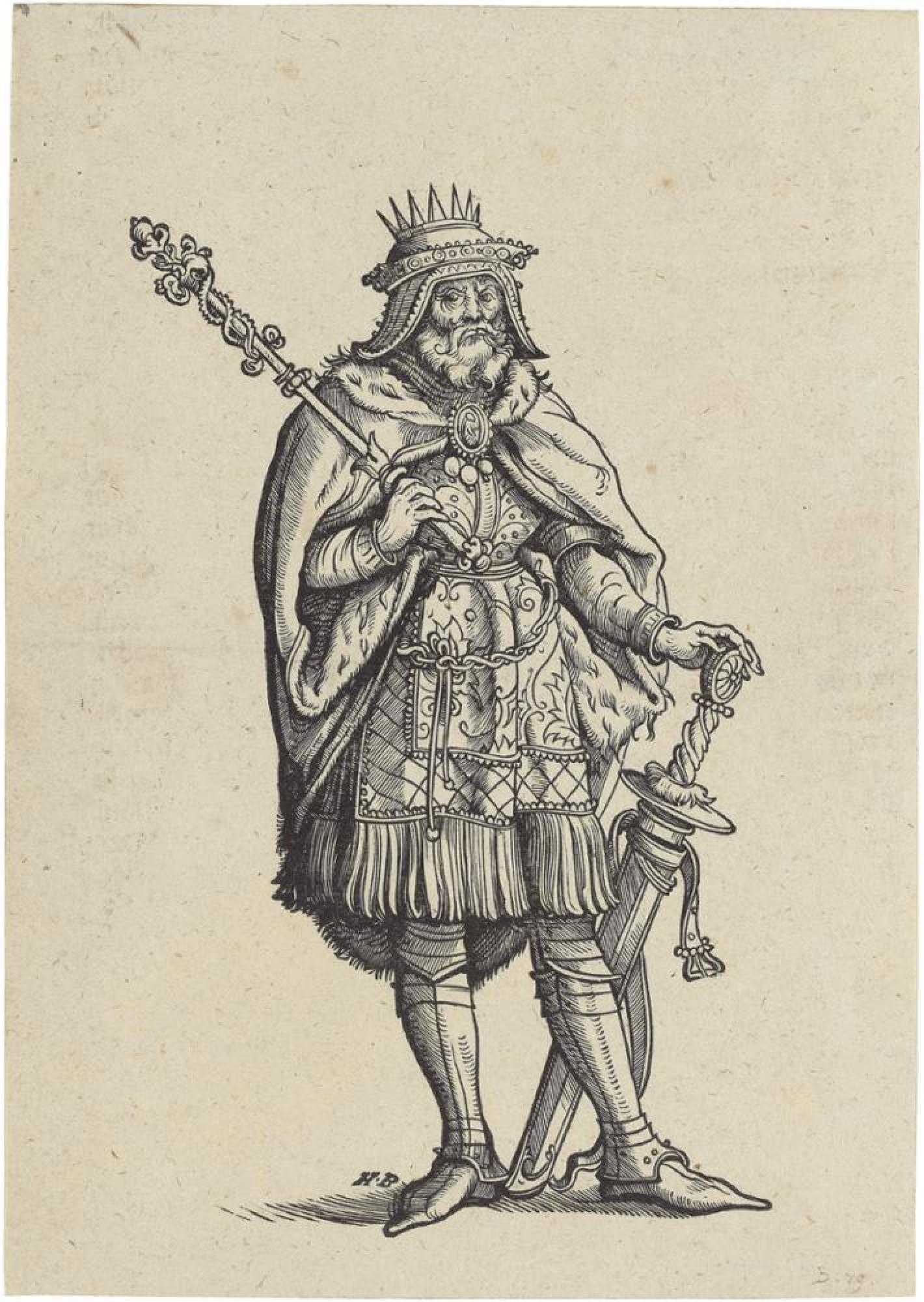 Die »Genealogie« wurde von Kaiser Maximilian I. Maximilian I. (1459-1519) in Auftrag gegeben, um seine Abkunft bis zurück zu dem Trojaner Hektor darzustellen. Es war das früheste der Großprojekte, seinen Nachruhm und den Rang seiner Herrscherfamilien mit repräsentativen Holzschnittfolgen zu verewigen. Wie viele dieser Projekte (etwa der »Weisskunig«) wurde auch die »Genealogie« niemals fertiggestellt. Dieser Holzschnitt konnte keinem Namen in der »Genealogie« zugeordnet werden. Er gehört zu einer Gruppe von vier Probedrucken, von denen jeweils nur ein Exemplar erhalten ist. Sie waren im »Augsburger Geschlechterbuch« (Inv. Nr. D 2010/777,39 [KK]) eingeklebt und wurden bereits im 19. Jahrhundert herausgenommen. [HMK]