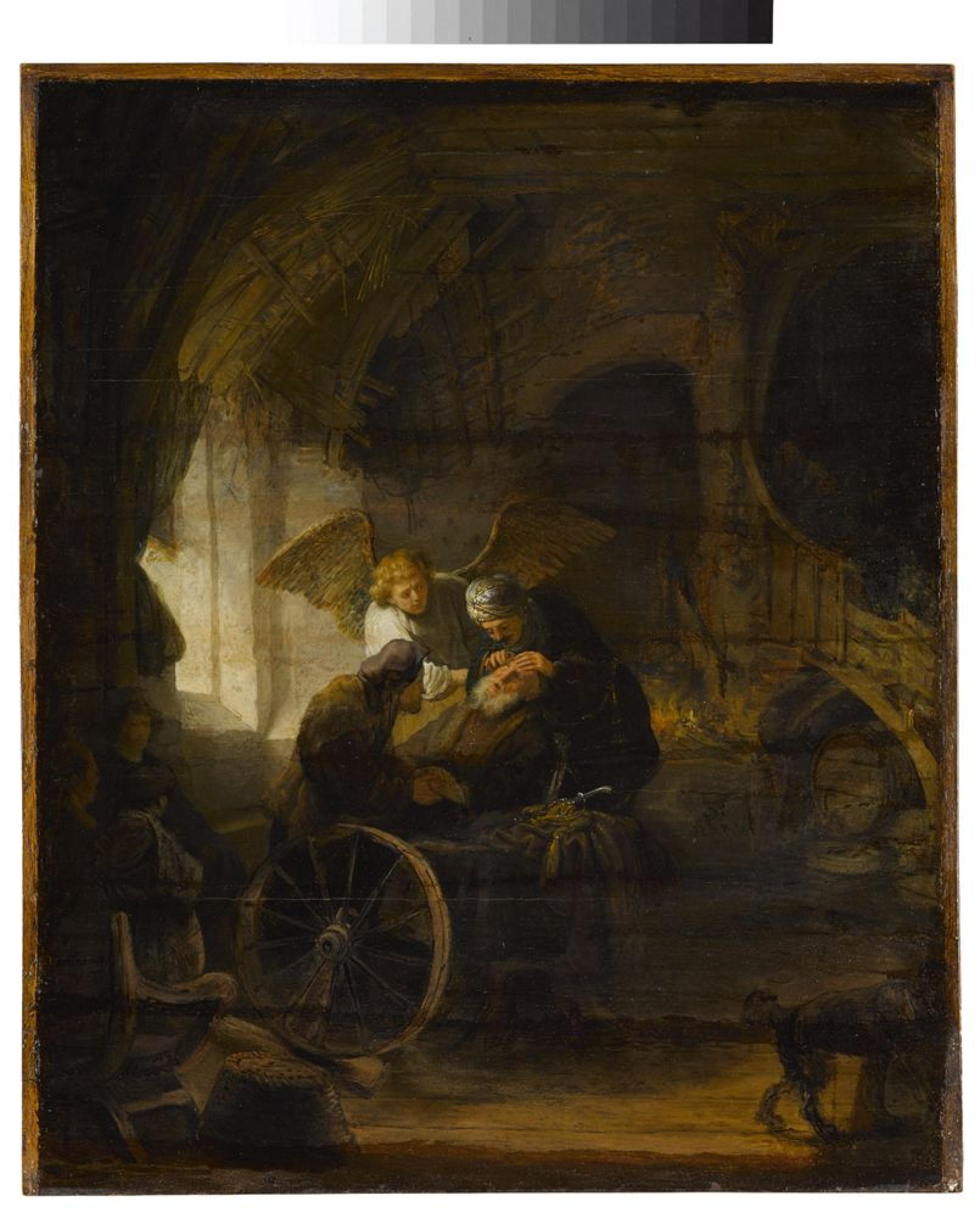 Von seinem Vater ausgesandt, um eine alte Schuld einzufordern, machte sich der junge Tobias zusammen mit dem Erzengel Raphael auf den Weg nach Rages in Medien. Am Tigris fing Tobias auf Geheiß des Engels einen Fisch und bewahrte Herz, Galle und Leber des Tieres als Arznei. Nach seiner Rückkehr folgte er der Anweisung des Engels und salbte die Augen des Vaters mit der Fischgalle. Der alte Tobias wurde wieder sehend. Der Künstler wich von der Überlieferung ab, indem er Tobias eine damals schon häufig praktizierte Staroperation an seinem Vater vornehmen ließ. Dennoch ist die Darstellung von dem wunderbaren Charakter des Vorgangs durchdrungen.