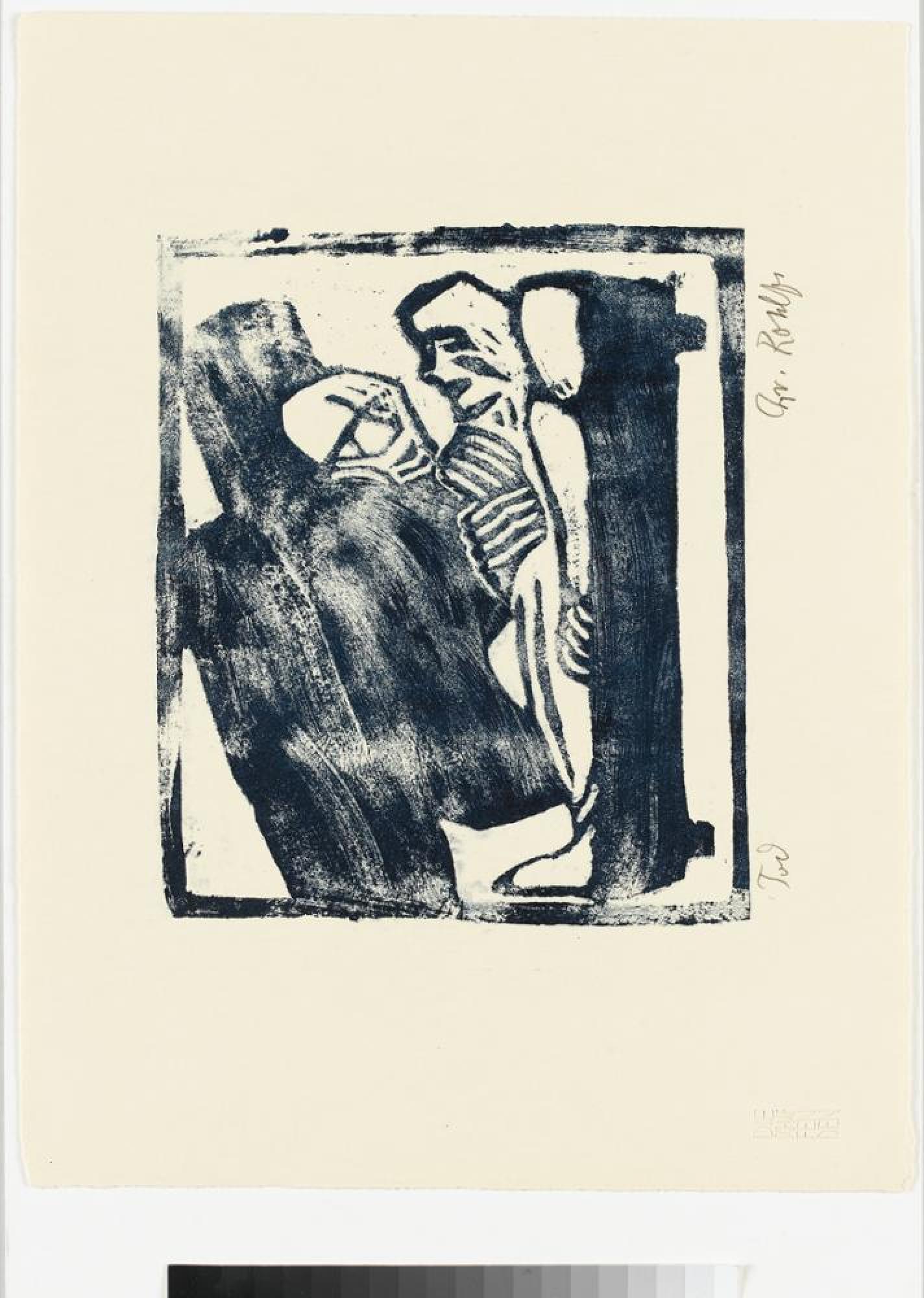 Der Tod entsteigt dem Sarg, dessen Teile wie riesige Flügel wirken, und beugt sich über eine ausgemergelte Figur, die auf einem Bett liegt. In einem zweiten um 1917 entstandenen Holzschnitt (Vogt 104) ließ Christian Rohlfs den Tod als Skelett mit dem Sarg auf dem Rücken mit großen Schritten dahinziehen. Über den Realismus und Impressionismus gelangte der Künstler erst spät zum Expressionismus, als er 1905 während eines Aufenthalts in den Sommermonaten in Soest Emil Nolde kennenlernte. Auch begann Rohlfs erst ab 1908 überhaupt mit der Druckgraphik. Der Holzschnitt wurde 1920 in die erste Mappe des zweiten Jahrgangs von »Die Schaffenden« aufgenommen, die im Gustav Kiepenheuer Verlag in Weimar erschienen ist.