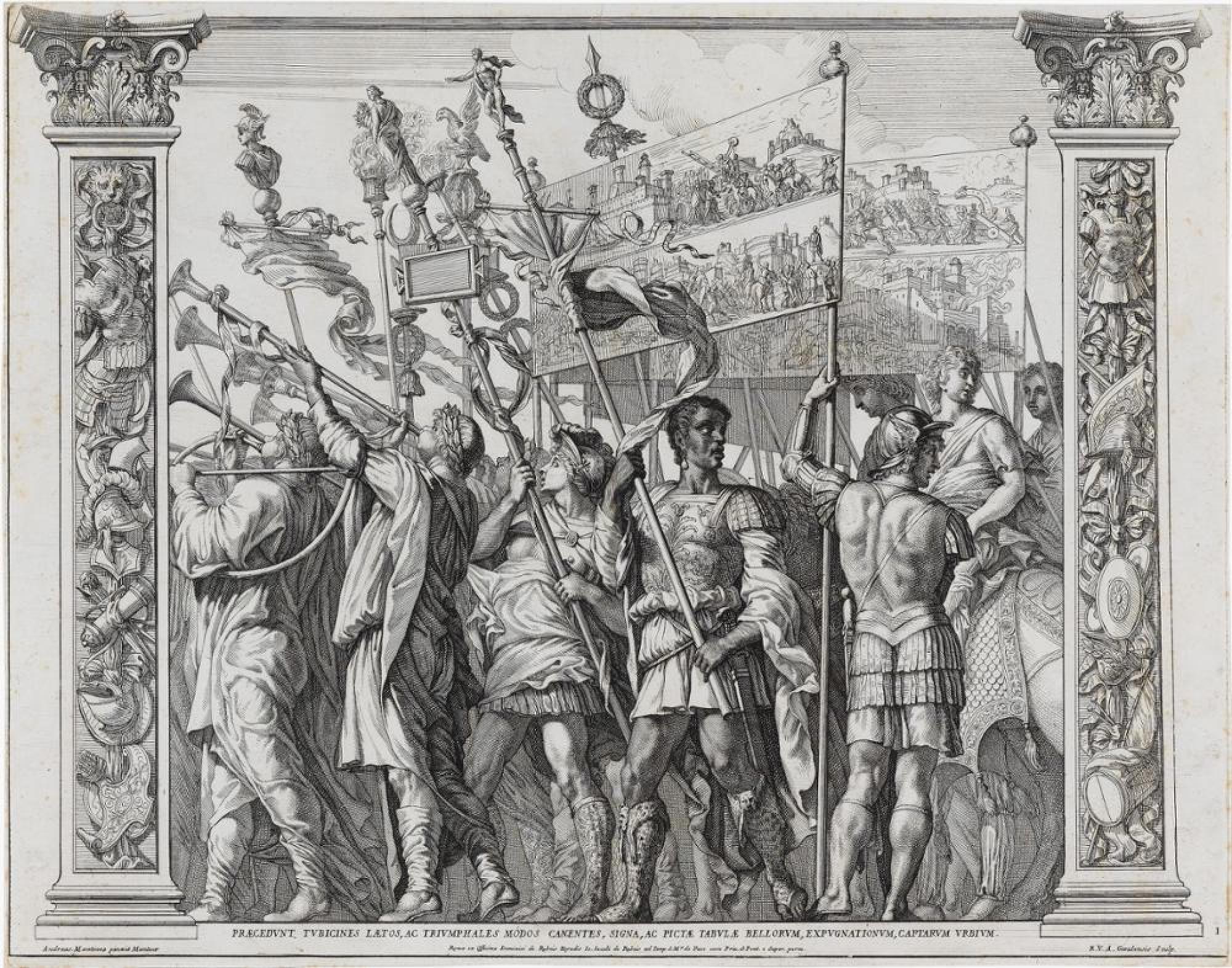 1692 schuf Robert van Audenaerde im Auftrag des Verlegers Domenico de' Rossi die Kupferstichfolge nach den Gemälden zum »Triumphzug Caesars« von Andrea Mantegna. Als Vorlage dienten ihm vor allem die Chiaroscuro-Holzschnitte von Andrea Andreani (Inv.Nr. A 22689-A 22698), die originalen Gemälde, die seit 1631 bereits in England waren, hat er nie gesehen. Andrea Mantegnas Gemäldezyklus »Triumphzug Caesars«, entstanden zwischen 1484 und 1492 vermutlich im Auftrag des Giovanni Francesco II. Gonzaga, Herzog von Mantua, für den »Corridoio del Passerino« des Palazzo della Corte. 1512 wird der Zyklus erstmals im neuen Palast der Gonzaga bei San Sebastiano erwähnt, wo ihn auch Andrea Andreani noch gesehen hat, bevor er in den Palazzo Ducale überführt wurde. Seit 1631, nachdem Charles I. 1629 den größten Teil der Gonzaga-Sammlung erworben hatte, befinden sich die Bilder im Besitz des englischen Königshauses und werden in Hampton Court aufbewahrt.