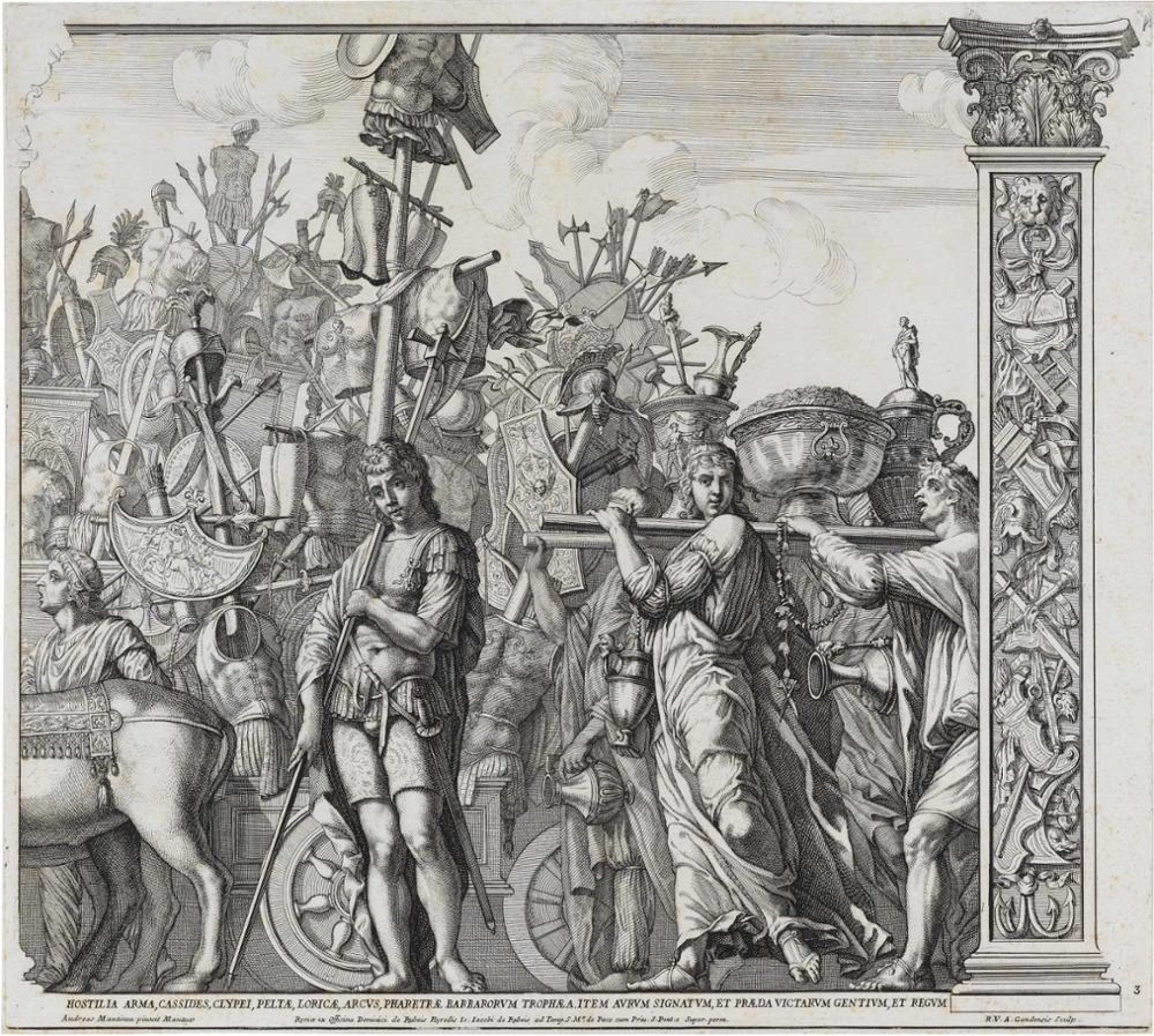 1692 schuf Robert van Audenaerde im Auftrag des Verlegers Domenico de' Rossi die Kupferstichfolge nach den Gemälden zum »Triumphzug Caesars« von Andrea Mantegna. Als Vorlage dienten ihm vor allem die Chiaroscuro-Holzschnitte von Andrea Andreani (Inv.Nr. A 22689-A 22698), die originalen Gemälde, die seit 1631 bereits in England waren, hat er nie gesehen. Andrea Mantegnas Gemäldezyklus »Triumphzug Caesars«, entstanden zwischen 1484 und 1492 vermutlich im Auftrag des Giovanni Francesco II. Gonzaga, Herzog von Mantua, für den »Corridoio del Passerino« des Palazzo della Corte. 1512 wird der Zyklus erstmals im neuen Palast der Gonzaga bei San Sebastiano erwähnt, wo ihn auch Andrea Andreani noch gesehen hat, bevor er in den Palazzo Ducale überführt wurde. Seit 1631, nachdem Charles I. 1629 den größten Teil der Gonzaga-Sammlung erworben hatte, befinden sich die Bilder im Besitz des englischen Königshauses und werden in Hampton Court aufbewahrt.