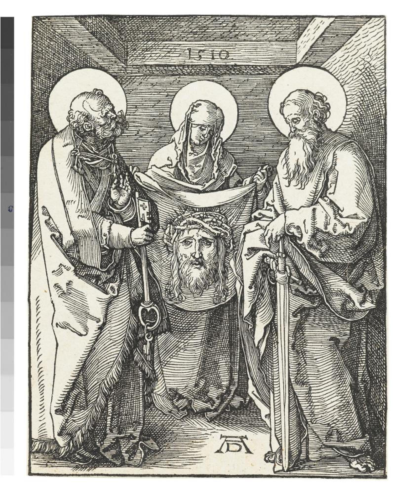 Die Darstellung der Passion galt Albrecht Dürer als höchste Aufgabe der Kunst. Über viele Jahre arbeitete er gleichzeitig an drei Folgen: der »Großen Passion« (Inv. Nr. A 1949/703, A 1949/701), der »Kupferstichpassion« (Inv. Nr. A 1965/GL 893,a-p), und der »Kleinen Passion«. Sie ist mit 37 Holzschnitten die umfangreichste, mit heilsgeschichtlicher Einbindung vom »Sündenfall«bis zum »Jüngsten Gericht«. 1511 veröffentlichte Dürer sie als Buch mit lateinischen Versen des Benediktiners Chelidonius (um 1460-152) im eigenen Verlag. Einzeldrucke sind bereits vor der Buchausgabe erschienen. Der Legende nach reichte Veronika Jesus auf dem Weg zur Kreuzigung ihr Tuch, in dem sich sein Antlitz abdrückte. Dürer wählte jedoch nicht diese Szene, sondern stellt sie zwischen die beiden wichtigsten Heiligen Petrus und Paulus. Blatt 23 ist ein früher Abdruck vor der Textausgabe von 1511. Die Erwerbung des Jahres 2014 ersetzt einen Kriegsverlust. [HMK]