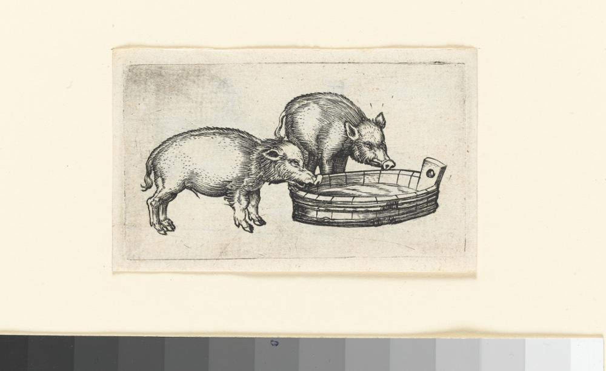 Prosaischer kann ein Bild kaum mehr sein: Zwei Schweine schnüffeln an einem hölzernen Trog, ob darin etwas zu Fressen sei. Sonst ist nichts zu sehen, kein Boden und kein Hintergrund. In der frühen Neuzeit waren Hausschweine noch nicht auf glatte Haut hin gezüchtet, sondern hatten Borsten - was der Kupferstecher hier mit präziser Strichelung wiedergibt. Aus seinem Werk spricht das genaue Interesse auch an den »niedrigsten« Gegenständen, nicht ohne Witz und Sympathie. Die frühere Zuschreibung an Ludwig Schongauer, Bruder des bekannteren Malers und Kupferstechers Martin Schongauer (um 1450/53-1491), wird in der Forschung nicht mehr aufrechterhalten. [HMK] Ausstellung: „Albrecht Dürer und Lucas van Leyden. Kunst und Leben um 1500“, 2015/16