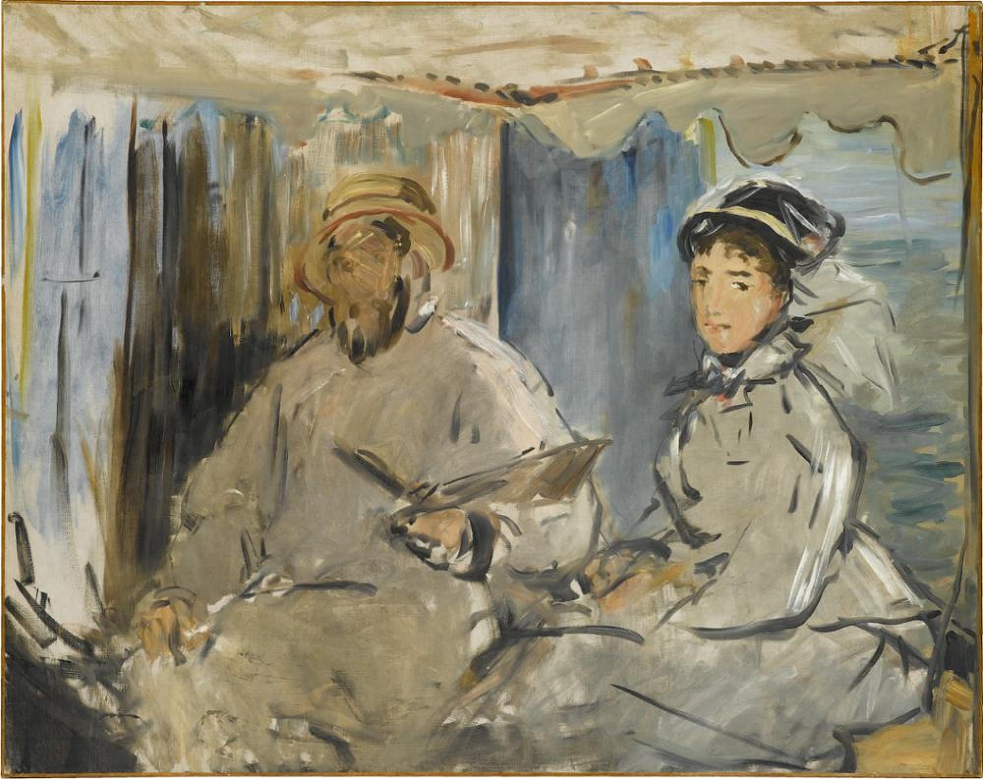 Das Gemälde zeigt den Maler Claude Monet in Begleitung seiner Frau Camille in dem Atelierboot, das er sich zum Arbeiten auf der Seine bei Paris hatte einrichten lassen. Wie kaum ein zweites Werk dokumentiert es die Arbeitsweise des Malers, die neben den traditionellen Methoden der damaligen Zeit bis heute geradezu revolutionär wirkt. Claude Monet erwarb das Werk, das er zeitlebens hochgeschätzt hat. Es befand sich längere Zeit in seinem letzten Wohnsitz Giverny.