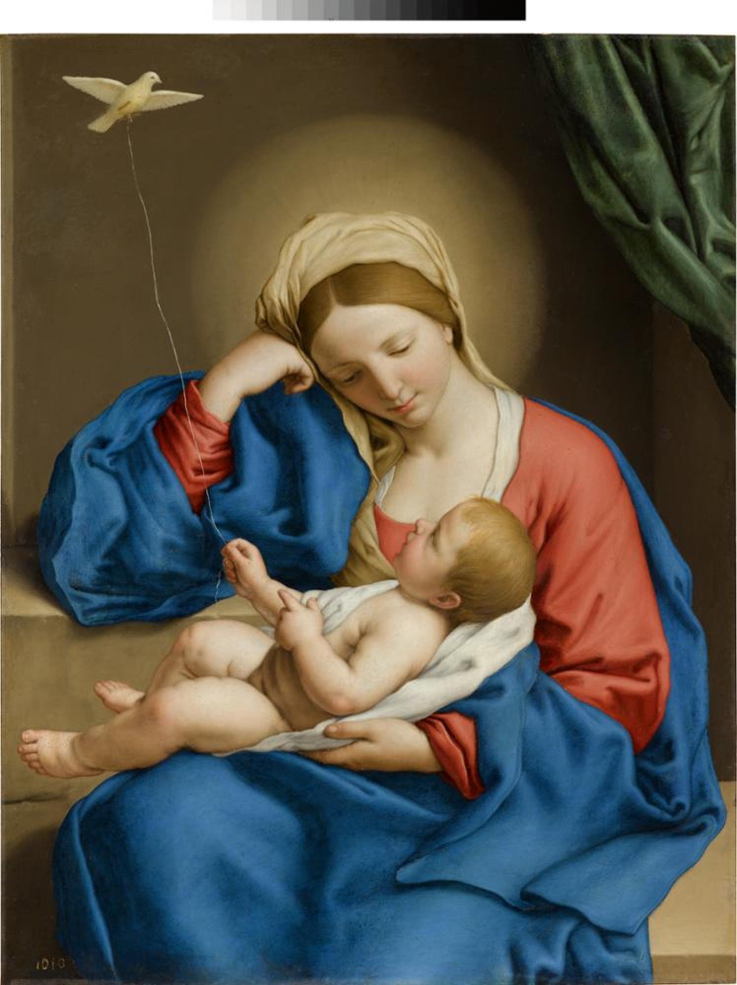 Salvi, der den Beinamen nach seinem Geburtsort Sassoferrato erhielt, hat sich vor allem mit seinen Mariendarstellungen einen besonderen Ruf erworben. Die Schulung an Werken Raffaels ist in ihnen unverkennbar. Die ebenmäßigen Gesichter feingeschnitten, erscheinen sie stets in hellen, porzellanartigen Farben, oft in einem fast mystischen Licht. Während Maria, den Kopf sinnend auf ihre rechte Hand gestützt, das Kind anblickt, lässt dieses einen kleinen Vogel an einem Faden fliegen. Obgleich es sich um kindliches Spiel handelt, ist der weiße Vogel wohl als Symbol des Heiligen Geistes zu verstehen.