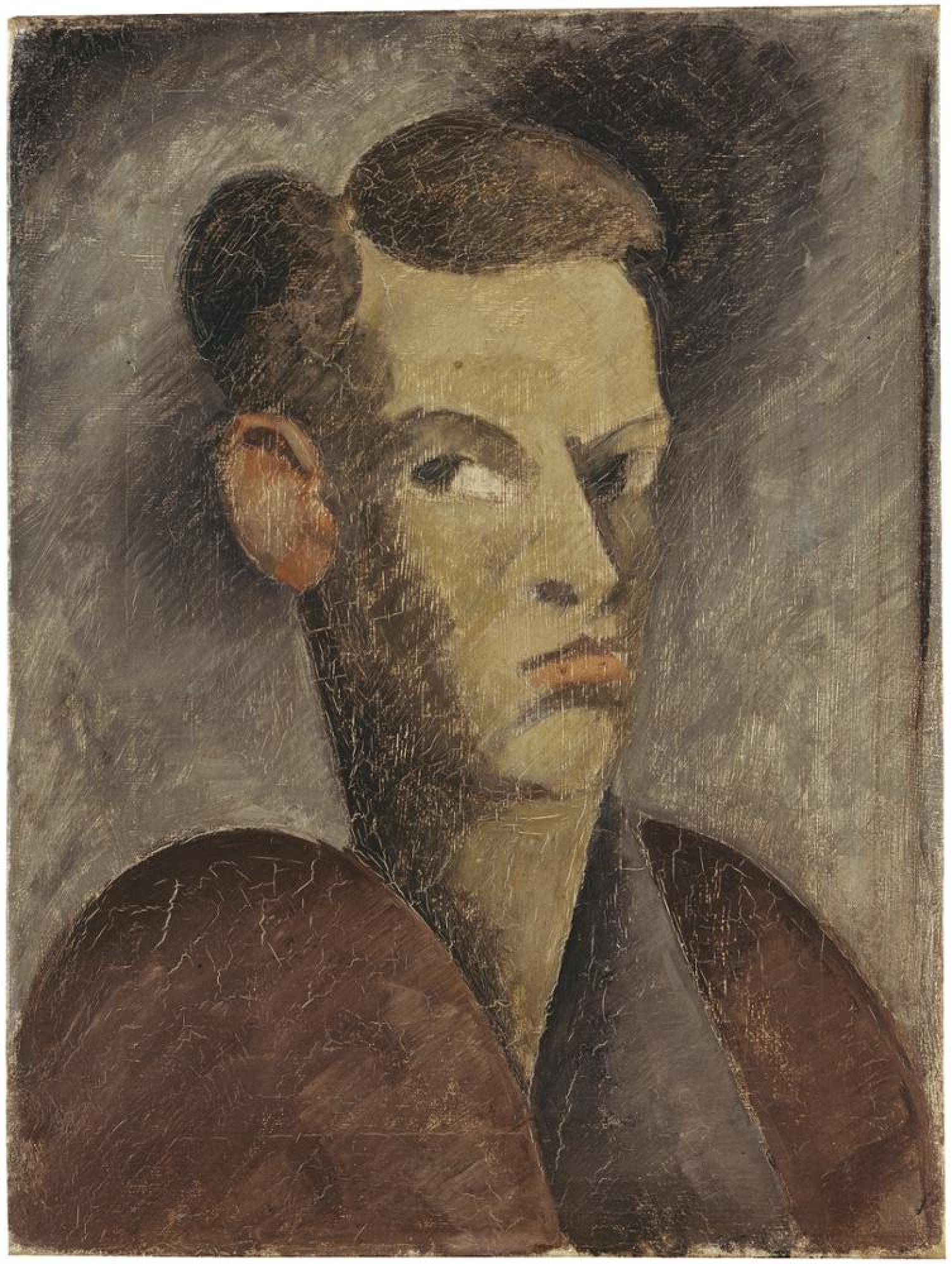 Das im Frühjahr 1912 in Berlin entstandene Selbstbildnis ist eines von nur vier, die Schlemmer überhaupt gemalt hat. In dieser für einen Figurenmaler ungewöhnlichen Distanzierung von der Selbstdarstellung, die noch durch den anonym gehaltenen Titel "Männlicher Kopf I" (die Bezeichnung "Selbstbildnis" wurde erst später hinzugefügt) unterstrichen wird, manifestiert sich Schlemmers zur Entpersönlichung, Verallgemeinerung und Typisierung tendierender Stilwille. So wandte sich der Vierundzwanzigjährige in Berlin auch nicht dem Expressionismus zu, sondern dem nach objektivierender Gesetzmäßigkeit strebenden Kubismus. In blockhaft geometrisierten Formen und einer verhaltenen Erdfarben-Skala konzipiert er das wuchtige, männlich-entschlossene Imago seiner selbst, getragen von dem Bewusstsein, in seiner Malerei den richtigen Weg gefunden zu haben. Im folgenden Jahr malt er eine Variante, die er selbst als "heller, blonder, weiblicher" charakterisiert.