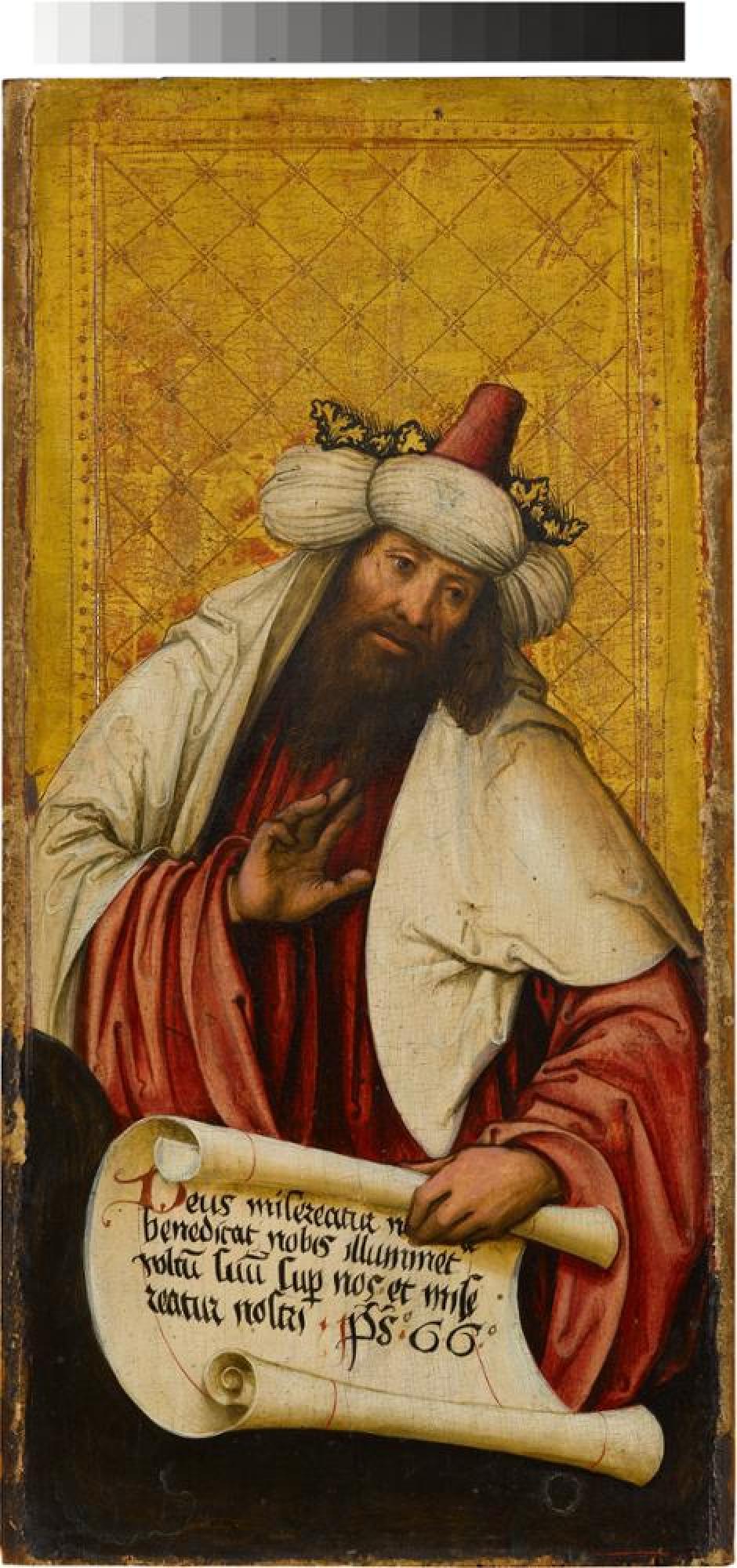 Die Darstellung König Davids gehörte, vermutlich als Ecküberhöhung, zum selben Altar wie auch die Tafel eines nicht identifizierbaren Propheten (Inv. Nr. 57). David, ca. 1004/03 - 965/64 vor Christus, einer der bedeutendsten Herrscher in der Geschichte Israels, gilt als Dichter und Prophet. Das Purpur seines Mantels und der morgenländische Königshut weisen auf seine königliche Würde hin; die Schriftrolle mit dem Text von Psalm 66,2 nimmt Bezug auf seine prophetische Gabe.