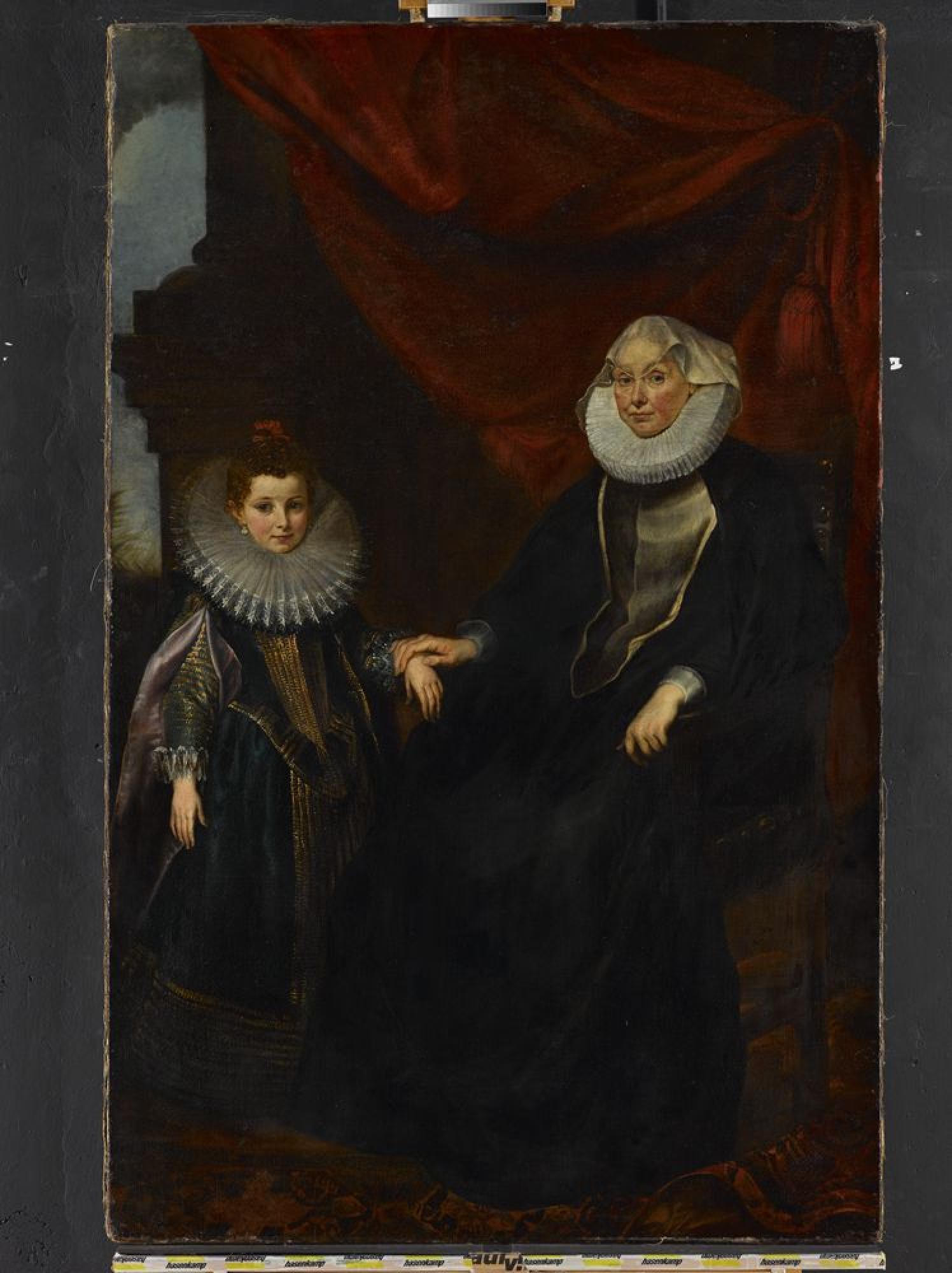 Peter Paul Rubens schuf im Winter 1605/1606 eine Reihe von Damenbildnissen der Genueser Oberschicht. Lange war die Identität der Stuttgarter „Alten Dame mit jungem Mädchen“ (ehem. Titel) nicht bekannt. Durch neue Forschungen (Orlando 2021) ist nun gesichert, dass es sich um Geronima Spinola Spinola und ihre Enkelin Maria Giovanna Serra handelt. Die Ältere trägt als Witwe und Laienschwester eines Konvents ein schwarzes Obergewand mit einem einfachen Leinenkragen und ein Tüchlein als Kopfbedeckung, ihre gesamte Erscheinung ist schmucklos. Das siebenjährige Mädchen posiert dagegen in höfisch-prächtiger Kleidung, die von einem ausufernden Spitzenkragen dominiert wird. Das lebendige Erscheinungsbild zeichnet Großmutter und Enkelin gelichermaßen aus und zeugt von Rubens’ Meisterschaft auf dem Gebiet der Porträtmalerei. Das Gemälde gehörte einst dem im Nationalsozialismus ermordeten jüdischen Ehepaar Rosa (†1943) und Jakob Oppenheimer (†1941) und wurde auf einer Auktion 1935 in Berlin zwangsversteigert. 1954 kam es zu einem privaten Vergleich zwischen dem damaligen Besitzer und den Erben Oppenheimer. Die Staatsgalerie erwarb das Gemälde 1965 aus Privatbesitz. Ein weiterer Anspruch der Erben auf das Gemälde wurde nach Recherchen einer externen Historikerin auf Basis der Washingtoner Erklärung von 1998 abgewiesen (Schrenk 2001).
