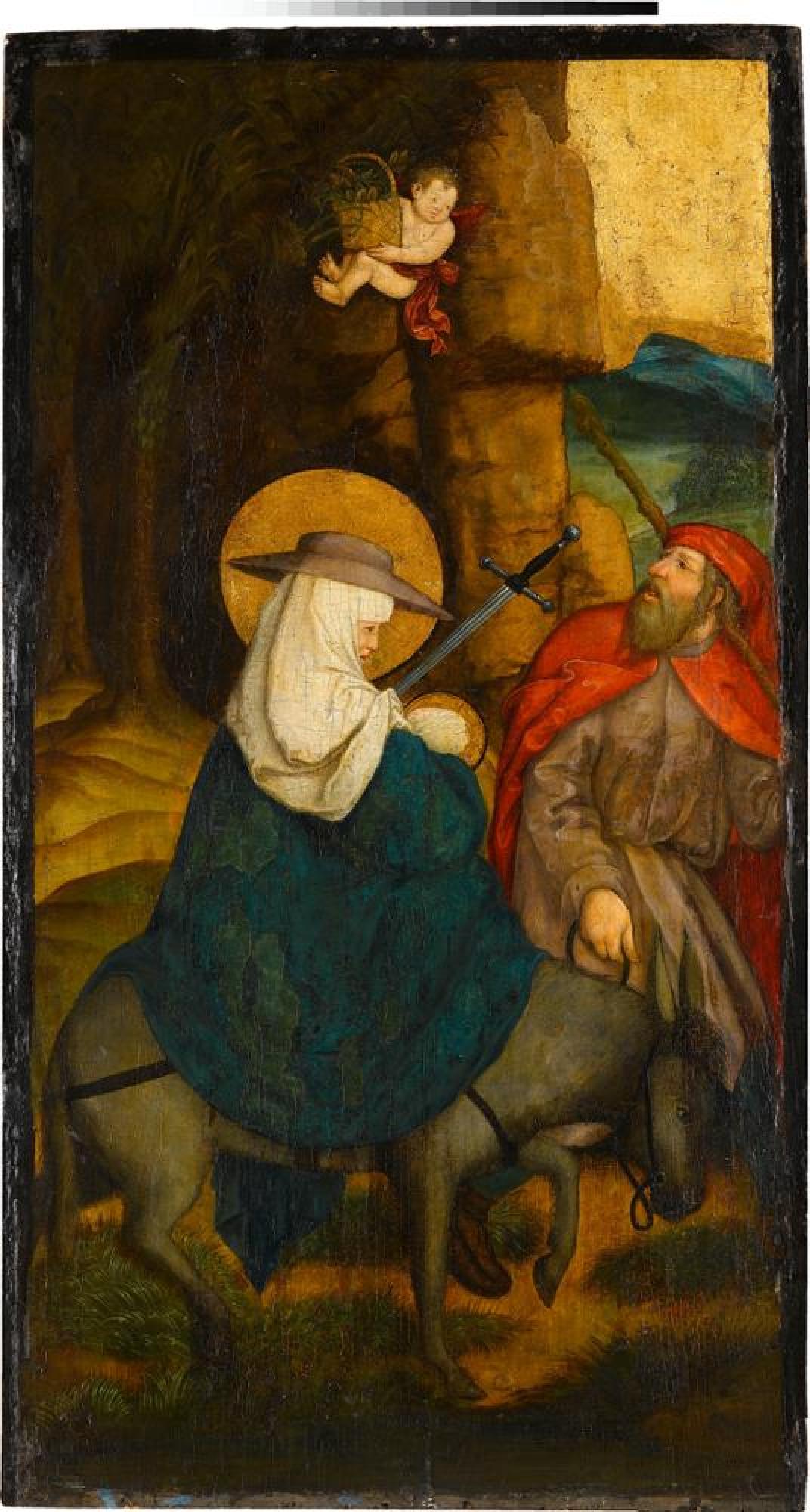 Die Darstellungen der „Flucht nach Ägypten" (Inv. Nr. 3) und der „Grablegung Christi (Inv. Nr. 4) sind Bestandteil eines als Sieben Schmerzen Mariens bezeichneten Bilderzyklus. Das Pendant bilden die Sieben Freuden Mariens, die durch die „Krönung Mariens" (Inv. Nr. 59) abgeschlossen werden. Die drei Tafeln gehörten einst zu einem Altar vermutlich aus Aulendorf oder Isny. Dieser wurde wohl im 19. Jahrhundert zerlegt und verkauft. Zugehörige Tafeln mit dem „Zwölfjährigen Jesu im Tempel" (Memmingen, Städtisches Museum), der „Beweinung Christi" (Leihgabe aus Privatbesitz im Museum der Stadt Ulm), der „Himmelfahrt Mariä" (Memmingen, Städtisches Museum) sowie der „Verehrung Mariens als Himmelskönigin" (Museum der Stadt Ulm) haben sich ebenfalls erhalten. Die Datierung ist im zweiten Jahrzehnt des 16. Jahrhunderts anzusetzen, die Ausführung ist zum größten Teil durch die Werkstatt Bernhard Strigels erfolgt. [SD]