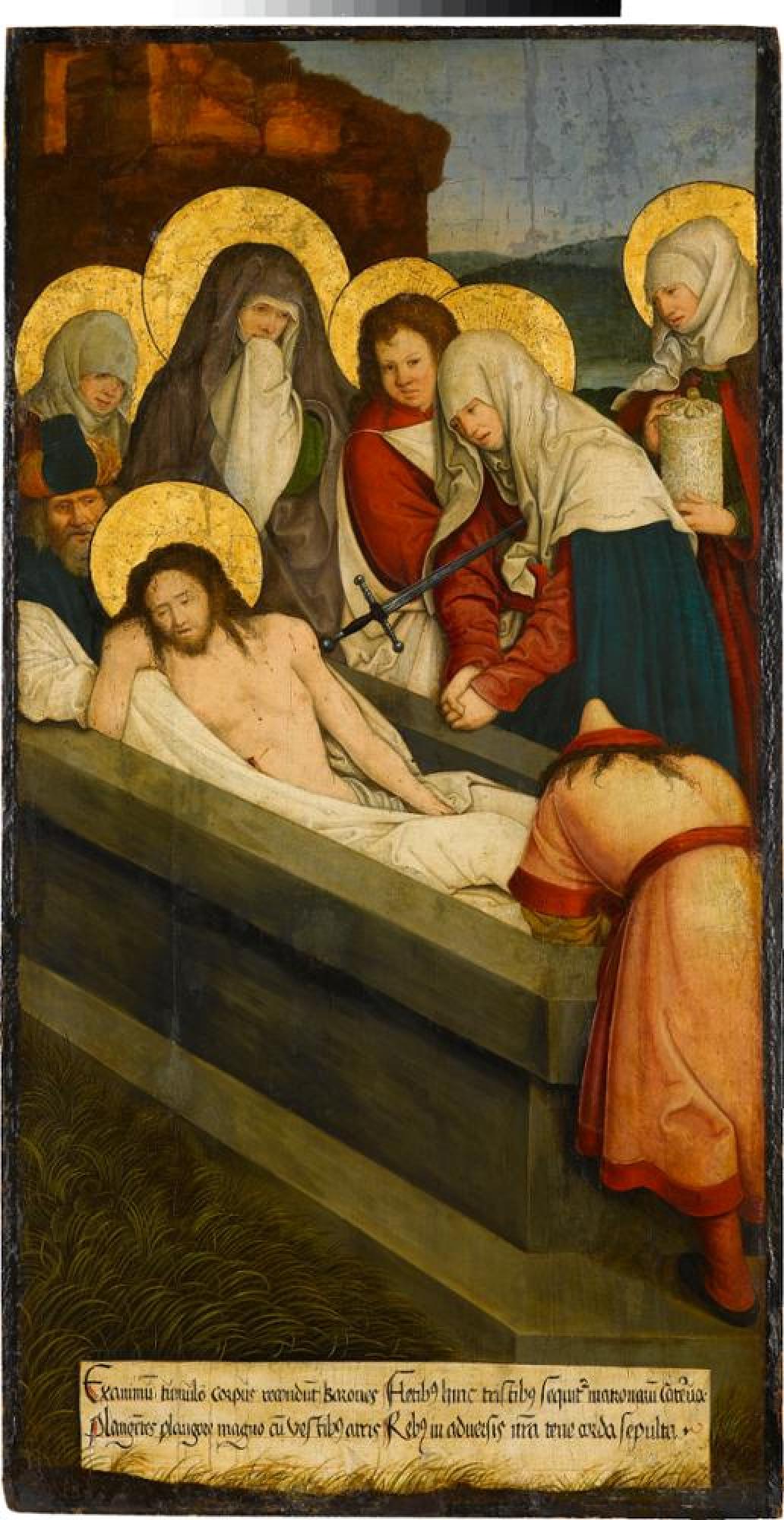Die Darstellungen der „Flucht nach Ägypten" (Inv. Nr. 3) und der „Grablegung Christi (Inv. Nr. 4) sind Bestandteil eines als Sieben Schmerzen Mariens bezeichneten Bilderzyklus. Das Pendant bilden die Sieben Freuden Mariens, die durch die „Krönung Mariens" (Inv. Nr. 59) abgeschlossen werden. Die drei Tafeln gehörten einst zu einem Altar vermutlich aus Aulendorf oder Isny. Dieser wurde wohl im 19. Jahrhundert zerlegt und verkauft. Zugehörige Tafeln mit dem „Zwölfjährigen Jesu im Tempel" (Memmingen, Städtisches Museum), der „Beweinung Christi" (Leihgabe aus Privatbesitz im Museum der Stadt Ulm), der „Himmelfahrt Mariä" (Memmingen, Städtisches Museum) sowie der „Verehrung Mariens als Himmelskönigin" (Museum der Stadt Ulm) haben sich ebenfalls erhalten. Die Datierung ist im zweiten Jahrzehnt des 16. Jahrhunderts anzusetzen, die Ausführung ist zum größten Teil durch die Werkstatt Bernhard Strigels erfolgt. [SD]